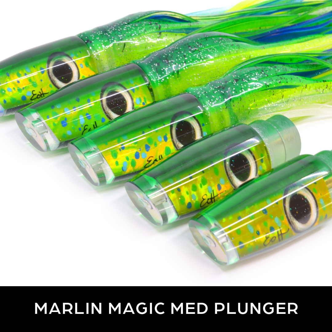 **Lure comes skirted as photographed. The Marlin Magic Super Dog is a massive plunger shaped head with mostly front forward taper with a long nose ...