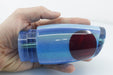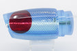 This particular head has a bright and colorful rainbow-iridescent fish scaled wrap along the sides of the ice blue pearl insert inside an ice blue resin pour with a set of red eyes.