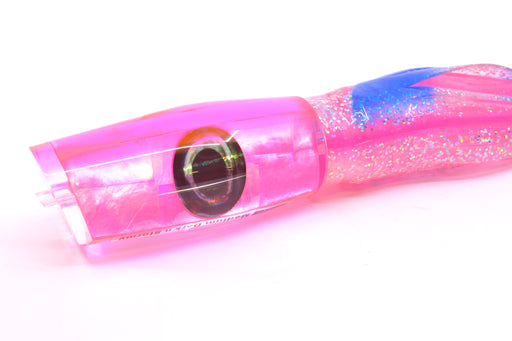 View full detailsMoyes Lures White MOP Pink-Blue Back Medium Pipe Bomb 12" 7.5oz Skirted Blue Bars/Pink