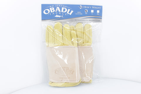 Medium Weight - Designed for 150# to 400# leader, the Obadu Medium Weight Gloves are perfect for leadering small to medium sized gamefish; such as sailfish, marlin, tuna, swordfish and sharks. The 6 oz cowhide leather protects your hands, while the deerskin gloves give you the flexibility and feel to maintain control when you’re on the leader. 100% Leather.
