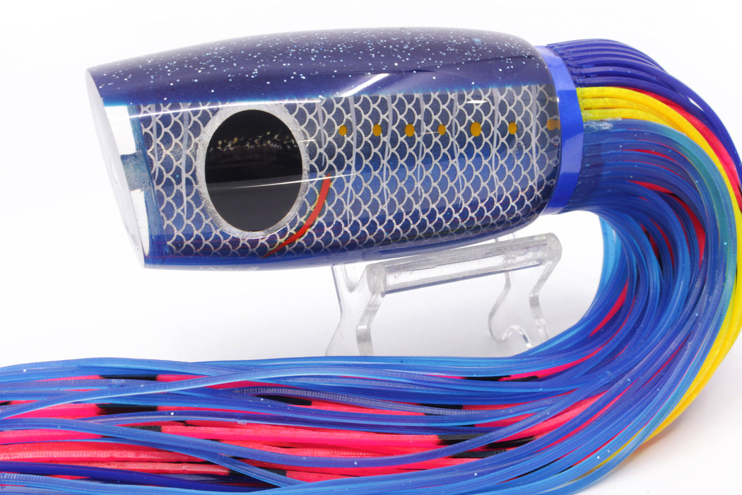 His Naja is the largest plunger that he has designed. Grander marlin written all over it. Super heavy weighted to allow it to be fished in all sea conditions. This is a killer Blue Marlin lure. Larger than a Super Plunger. The lure regularly bursts through the surface, makes a trail of bubbles, and then drops down under about a foot. Huge plunger shaped head with a slight front and rear taper.
