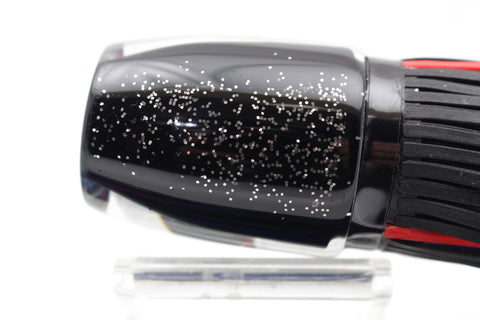 This particular head has a silver rainbow-iridescent patterned wrap along the sides of the black insert with blue tiger stripes and a black glittered back with three red dots under each eye. Comes with perfectly matching hula skirts in black over blue with a red lateral line.