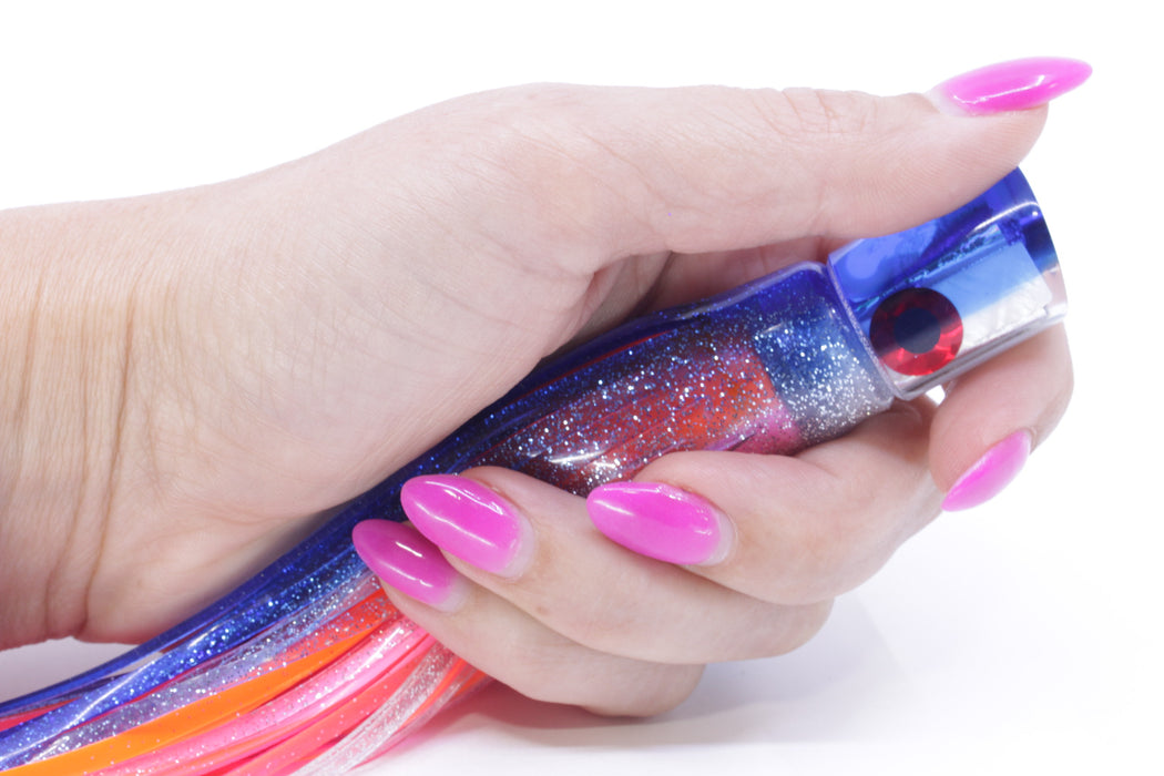 The Coggin Lures Peanut Pusher is a small short nosed "pusher" style lure designed perfectly to fill the boat with Aku/Skipjack, Mahi Mahi/Dorado, Kingfish, etc. Perfect size for smaller big game trolling with 5.5" skirt saddles. Basically a short nosed tube style bait with a flat back and an angled nose.