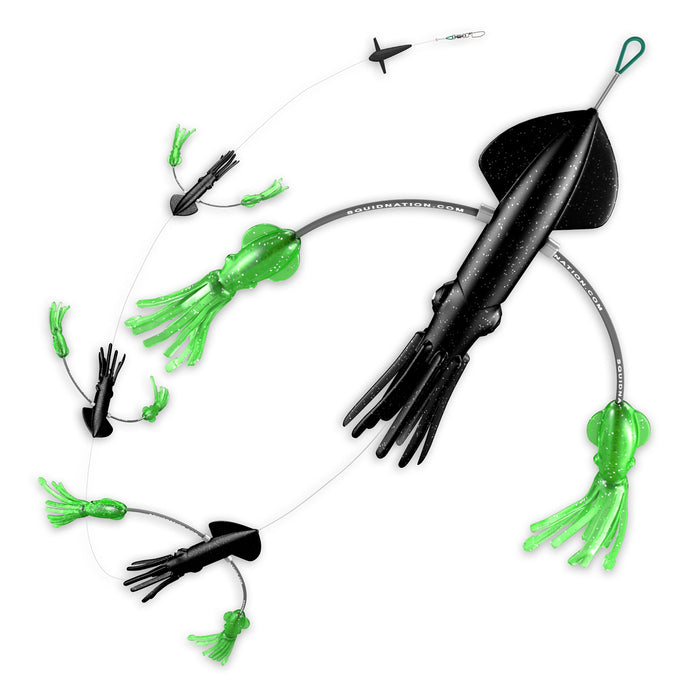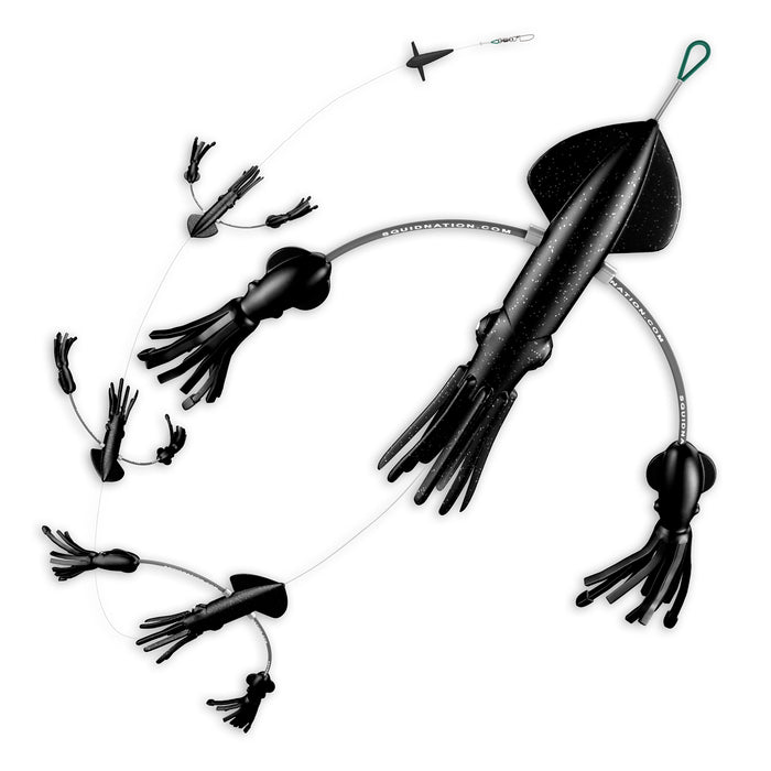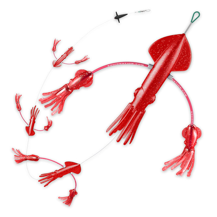 "That Flippy Floppy Thing" is a daisy chain depicting a critter scattering a bunch of bait in the air. It is made with 9 inch Squidnation Rubber Mauler Squids, 8 six inch Squidnation Fat Daddy Squids and 1 Squidnation 5 inch bird. Rigged on 275lb test tipped with a 300lb Marlin Coast Lock swivel. It has been a proven sailfish and marlin raising machine. Best to use when targeting Marlin, Sailfish, Tuna, Dolphin and Wahoo. Try one in your spread today. You will be convinced very quickly as to way it has succeeded so well."